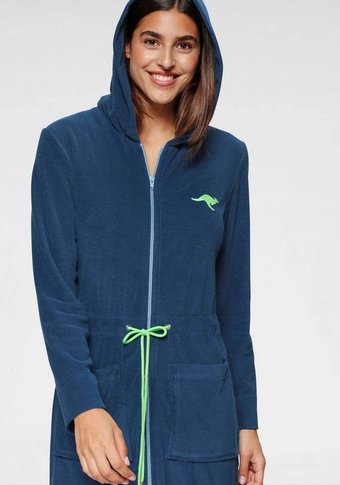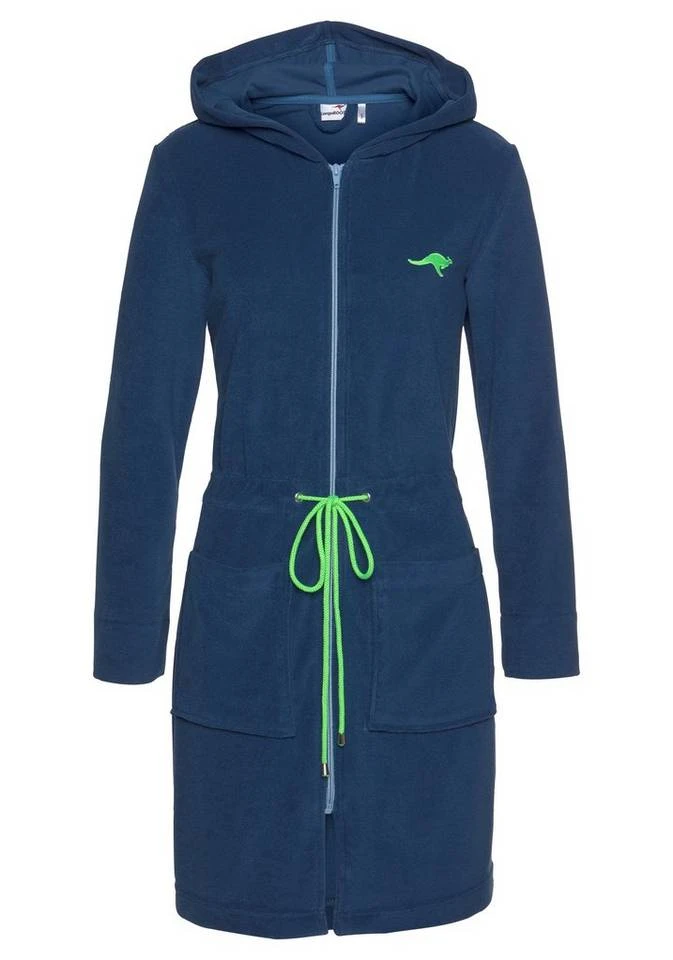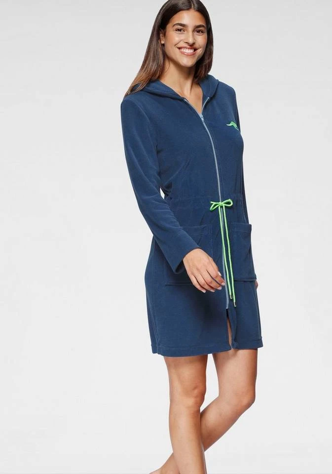 In diesem sportlich, modernen Damenbademantel der Marke Kangaroos machen sie immer eine gute Figur. Der Bademantel Kira überzeugt durch seine schöne Kurzform, mit Kapuze, Reißverschluss und kontrastfarbenem Bindegürtel. Der Stoff ist aus 80% Baumwolle und 20% Polyester hergestellt und unterstützt die Initiative Cotton made in Afrika. Die weiche, anschmiegsame Qualität macht ihn ideal für gemütliche und erholsame Momente auf dem Sofa oder in der Sauna. Natürlich ist der Bademantel bis 60°C maschinenwaschbar und auch trocknergeeignet.