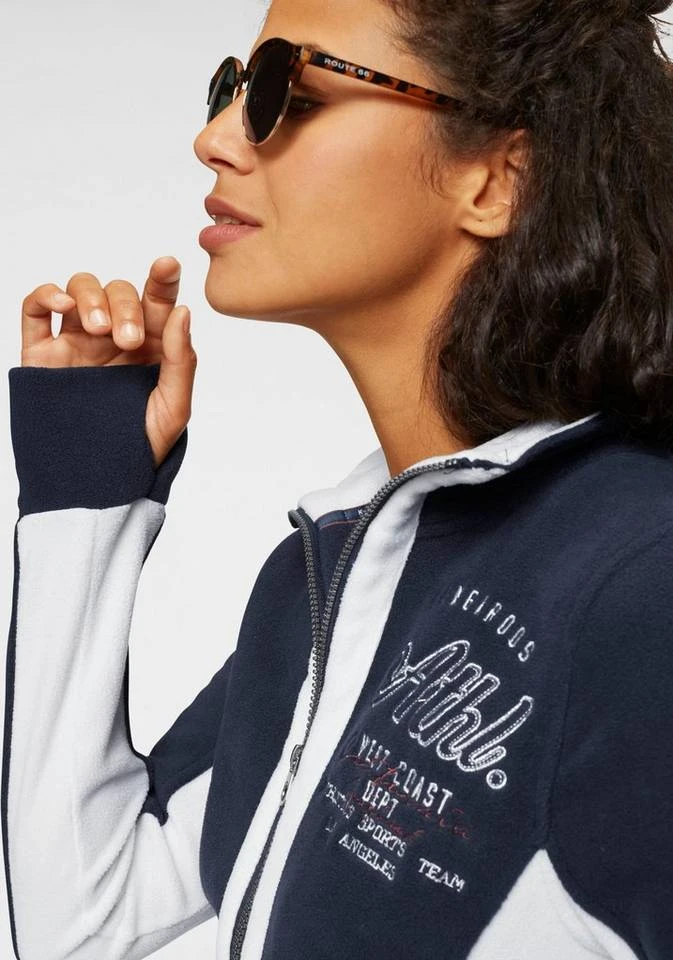 Mit der Fleecejacke von Kangaroos bist du bestens gerüstet für kühle Tage. Das wärmende Freizeitbasic punktet mit hoch schließendem Stehkragen und zusätzlich mit figurschmeichelnden Längsstreifen-Einsätzen am Reißverschluss vorn, an der Seite und am Ärmel, welche tolle Kontraste setzen und gleichzeitig für eine schlankere Silhouette sorgen. Praktische Details sind außerdem die seitlichen Eingrifftaschen und die Daumenlöcher, die der Damenjacke eine sportive Attitüde verleihen. Der tonale Logodruck am Ärmel und die Logostickerei auf der Brust runden das Gesamtbild der Jacke charakteristisch ab. Aufgrund der windabweisenden Eigenschaften bietet dir die kuschelweiche Fleece-Qualität besten Support bei allen Aktivitäten. Keine Frage, die Fleecejacke von Kangaroos bereichert dein Outdoor-Repertoire in puncto Funktionalität und Style!