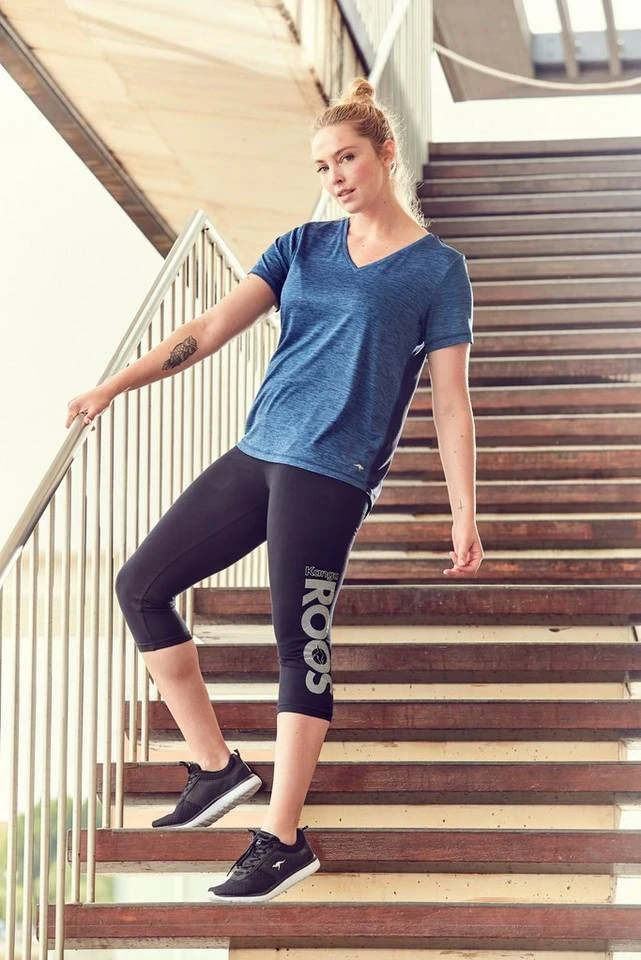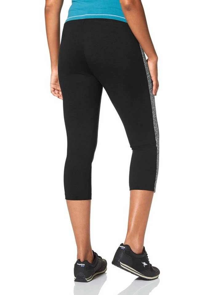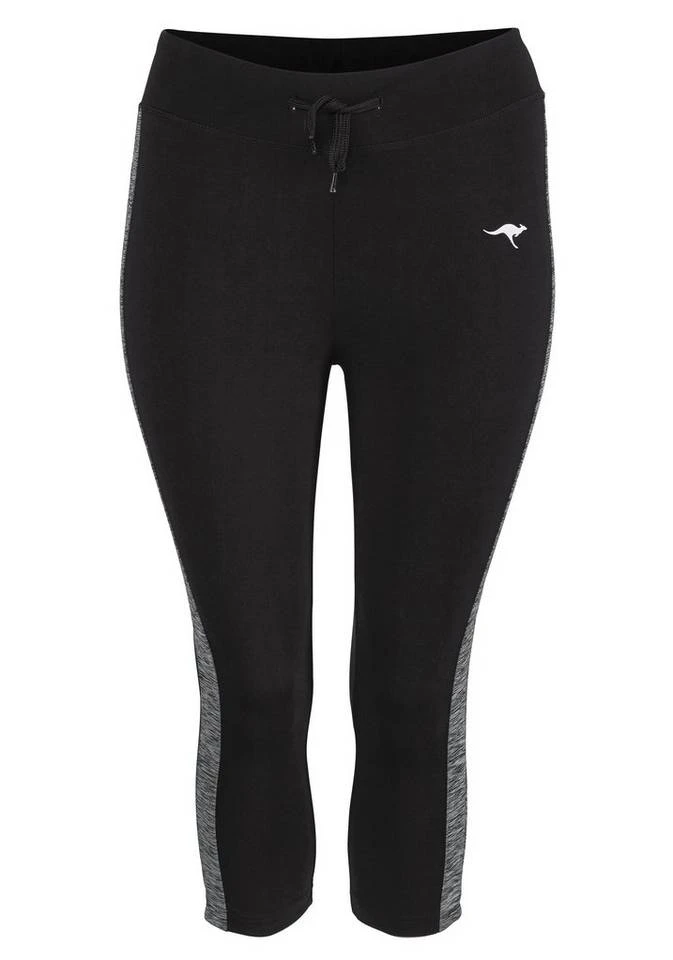 Trainingspartner mit Eyecatchereffekt. Die Funktionstights in 3/4-Länge von Kangaroos überzeugen bei Work-out und Fitness mit der schnell trocknenden und atmungsaktiven Qualität. Diese funktionalen Vorteile werden stilsicher von der sportiven Caprilänge, einem kleinen Logoprint und den seitlichen, optisch streckenden Kontrasteinsätzen ergänzt. Ein Sportshirt dazu oder einen Oversize-Hoodie und los geht’s auf die Laufrunde oder ins Sportstudio. Die 3/4-langen Funktionstights von Kangaroos für Frauen, die beides wollen: Fitness und Style!