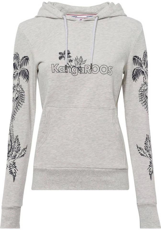 Mit dem Hoodie von KangaROOS lassen sich einfach neue Outfits zusammenstellen. Eine Kapuze ist bei diesem Hoodie angesetzt. Sie hat einen Kordelzug, um die Kapuzenweite zu verstellen. Die langen Ärmel enden in einem Rippstrickbündchen, das für guten Sitz sorgt. Dieses Sweatshirt ist hüftbedeckend sowie figurumspielend geschnitten, sodass du dich wohlfühlst. Am Bauch ist eine Kängurutasche aufgenäht, in der du dir deine Hände wärmen kannst und die gleichzeitig lässig aussieht.