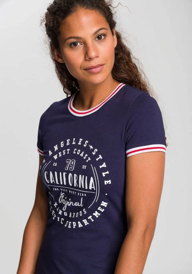 Sportiver Glamour? Und ob! Das Jerseykleid von Kangaroos setzt auf spannende Kontraste und lässt den Frontprint im Casual-Stil mit einem funkelnden Glitzern zur Geltung kommen. Gestreifte Bündchen an Ausschnitt und Ärmeln ergänzen das Shirtkleid um coole Anleihen aus dem College-Look. Der trageangenehme Baumwolljersey mit Stretchanteil bringt den figurbetonten Schnitt des Jerseydresses gelungen zur Geltung. Stilecht mit flachen Sneakers kombiniert punktet das Jerseykleid von Kangaroos als Basic mit modischer Raffinesse.