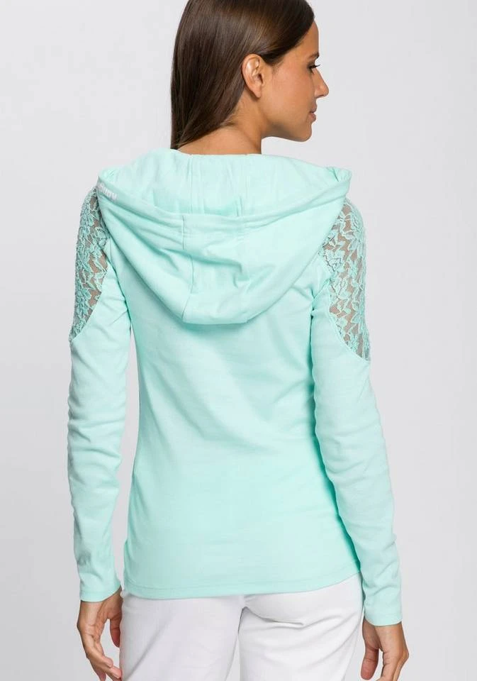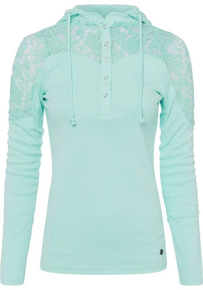 Sehr feminin, das Langarmshirt von KangaROOS! Der gesamte Schulterbereich und ein Teil der Ärmel sind aus zarter Spitze gearbeitet. Die Kapuze mit seitlichem Logodruck und Kordeln mündet in einen tiefen V-Ausschnitt mit Druckknöpfen, mit dem man das Dekolleté sehr vorteilhaft in Szene setzen kann. Ziersteppung an den seitliche Nähte und ein Markenlogo unterstreichen den topmodischen Look des Kapuzenshirts. Insgesamt ist das Hoodie figurbetont gearbeitet und – abgesehen vom Spitzeneinsatz – aus weicher Feinrippqualität. Es trägt sich sehr angenehm und sieht dabei sehr stylisch aus. Klar, dass dieses Langarmshirt von KangaROOS ein echter Upgrader ist für jeden Jeans-Look. Must-have!