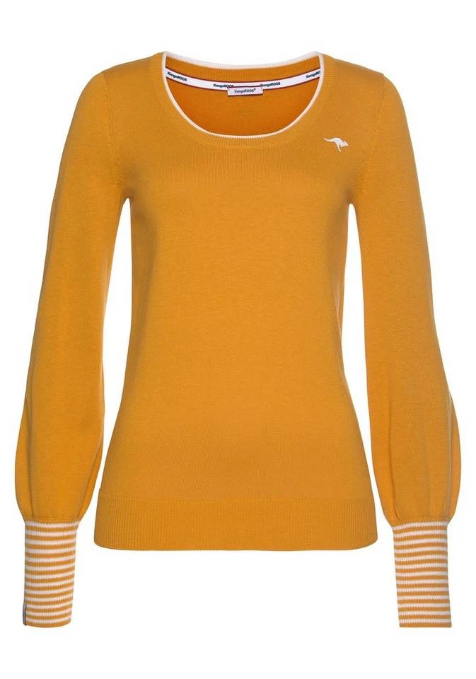 Softe Maschen mit Vintage-Touch. Ganz nonchalant verbindet der Pullover von Kangaroos einen lässigen Stil mit modisch charmanten Designelementen. Der Halsausschnitt ist rund und weit geschnitten, die Ballonärmel spielen mit Extravolumen und werden von langen, fein gestreiften Rippbündchen eingefasst. Ein Hosenrock oder eine weite Palazzohose mit Blockabsatz-Stiefeln ergänzen den weichen Feinstrickpulli perfekt. Lust auf femininen Strick mit dem besonderen modischen Kick? Der Pullover von Kangaroos verleiht deiner Garderobe ein trendy Style-Upgrade.