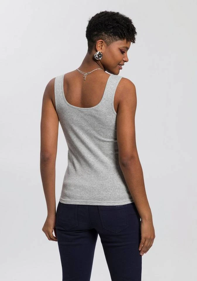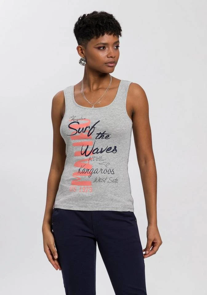 Mit dem Tanktop von KangaROOS lassen sich einfach neue Styles kombinieren. Dieses Top hat einen Rundhalsausschnitt und ist hüftbedeckend sowie sehr figurbetont geschnitten, sodass deine Silhouette schön in Szene gesetzt wird.