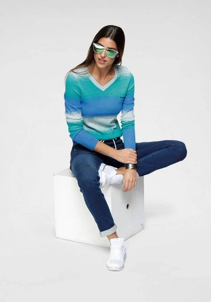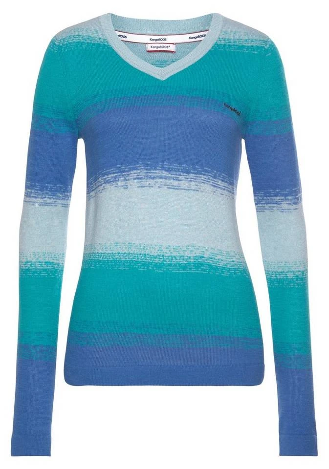 To dye for! Denn dieser Farbverlauf sieht nicht nur cool und urban aus, der Pullover von Kangoroos mit V-Ausschnitt ist auch in jeder einzelnen Ausführung ein angesagtes Unikat. Auf der Brust sitzt eine kleine 3D-Logo-Typo in Kontrast, sonst spricht das frische Modedesign für sich. Trage den Strickpulli zur Jeans, zum Minirock oder zur weißen Slim-fit-Pant. In allen Kombinationen steht der unkomplizierte Pullover von Kangaroos für moderne Eigenständigkeit und Charakter.